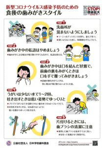 新型コロナウイルス感染症予防のためのポスターを作成しました。 お目に留まる場所に掲載いただきまして、是非ともご活用ください。 日本学校歯科医会として、学校における集団歯みがきやフッ化物洗口が原因でクラスターが発生したとの報告は、これまで受けておりません(令和4年7月)