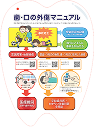 学校現場において、児童生徒が歯・口のけがをした場合、即時対応するための緊急時マニュアル。チャート式で迷いなく使用可能。リングなどを通せる穴が開いており、保健室の目の届きやすい場所にかけておける。また、QRコードからは事故発生直後の対応についてさらに詳しく書かれたページにアクセス可能。万一の場合に備え、裏面の緊急対応ができる医院の連絡先は予め記入を。