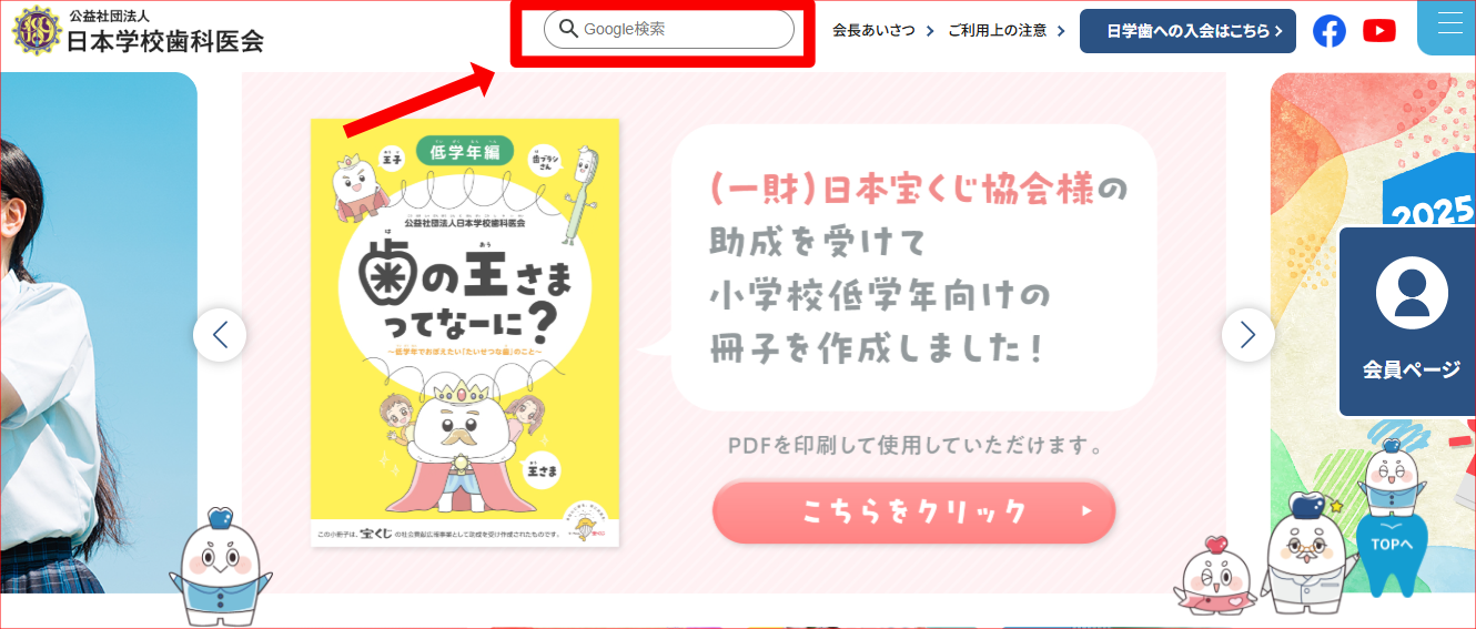 日本学校歯科医会HPのサイト内検索ができるようにGoogle検索窓を設置しています。(会員ページは除く)