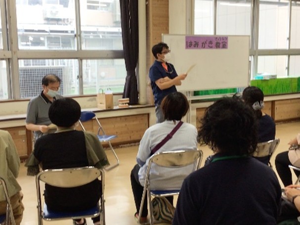 正しい歯みがきを習得し継続することを目標とし、当校の特色ある教育活動として、主に学校歯科医と行う「小学部1年生親子歯みがき教室」、「高等部3年生歯みがき教室」を行っています。また、毎日の歯みがきや、週1回フッ化物洗口を実施し、学校歯科保健活動に取り組んでいます。