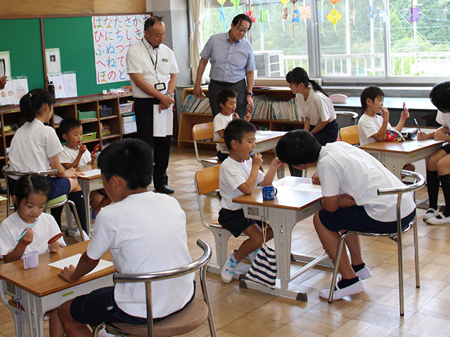 本校は里山の自然豊かな環境にある、児童数47人、2・3年生が複式学級の小規模校です。教育目標「自ら考え、豊かな心をもち、最後までやりぬく子」のもと、少人数を生かした教育活動を進めています。学校歯科保健では「自分の健康課題を捉え、進んで歯と口の健康を保持増進できる児童の育成」を目標に掲げ、毎日の歯みがき、週1回のフッ化物洗口、鏡を用いた丁寧な歯みがきに取り組んでいます。さらに、児童委員会による声かけ活動等が習慣化を支え、歯みがきは本校の自慢の一つです。学校・家庭・地域が連携し、生涯にわたり歯と口の健康を大切にする力を育んでいます。
